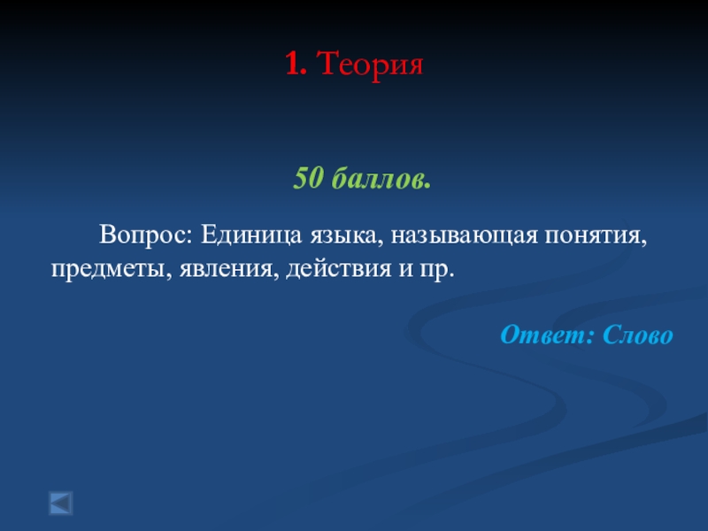 1. Теория 50 баллов.    Вопрос: Единица языка, называющая понятия, предметы, явления, действия и