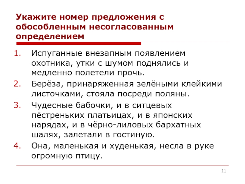 Слайд 11Укажите номер предложения с обособленным несогласованным определением