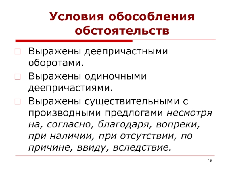 несмотря на, согласно, благодаря, вопреки, при наличии, при отсутствии, по причине, ввиду, вследствие.
