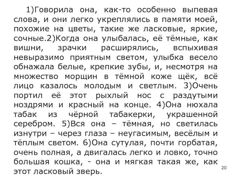 памяти моей, похожие на цветы, такие же ласковые, яркие, сочные.2)Когда она улыбалась, её тёмные, как вишни, зрачки расширялись, вспыхивая невыразимо приятным светом, улыбка весело обнажала белые, крепкие зубы, и, несмотря на множество морщин в тёмной коже щёк, всё лицо казалось молодым и светлым. 3)Очень портил её этот рыхлый нос с раздутыми ноздрями и красный на конце. 4)Она нюхала табак из чёрной табакерки, украшенной серебром. 5)Вся она – тёмная, но светилась изнутри – через глаза – неугасимым, весёлым и тёплым светом. 6)Она сутулая, почти горбатая, очень полная, а двигалась легко и ловко, точно большая кошка, - она и мягкая такая же, как этот ласковый зверь.