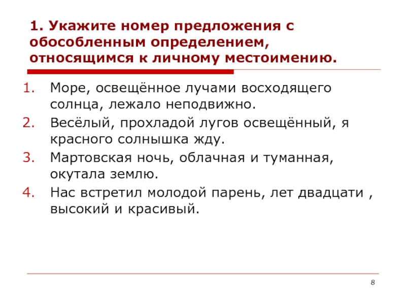 Слайд 81. Укажите номер предложения с обособленным определением, относящимся к личному местоимению.