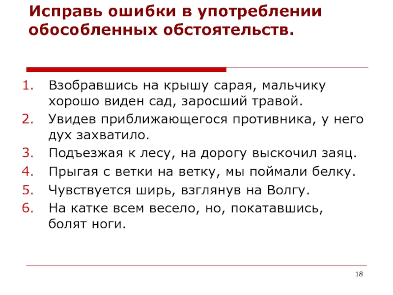 Слайд 18Исправь ошибки в употреблении обособленных обстоятельств.