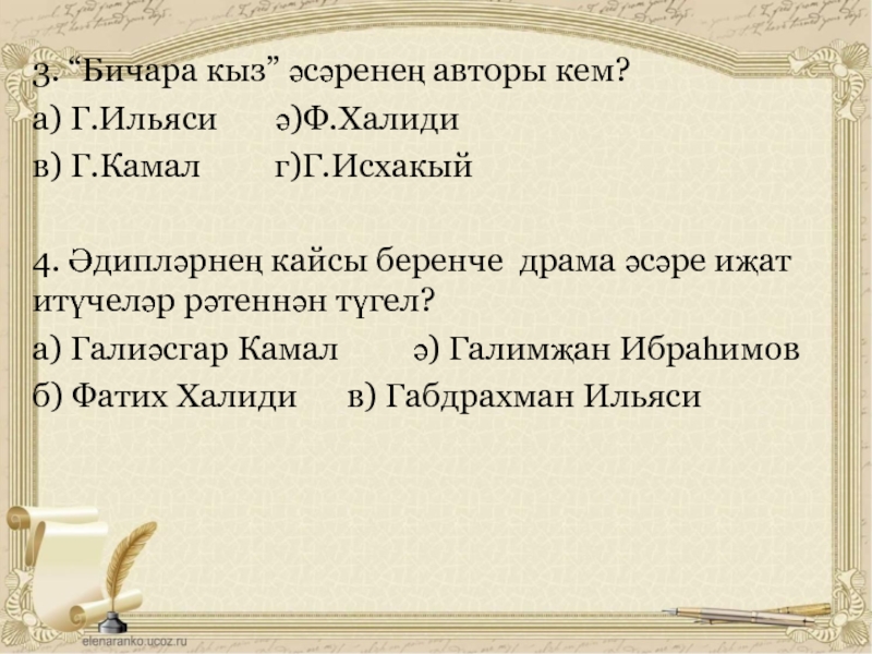 Слайд 33. “Бичара кыз” әсәренең авторы кем?