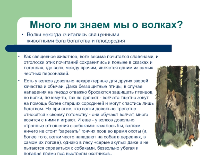 Как священное животное, волк весьма почитался славянами, и отголоски этих почитаний сохранились и поныне в сказках и легендах, где волк, между прочим, является одним из самых честных персонажей.