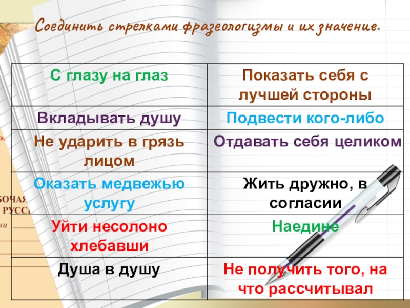 Соедините перепутанные прилагательные и существительные в верные фразеологизмы, объясните их значение