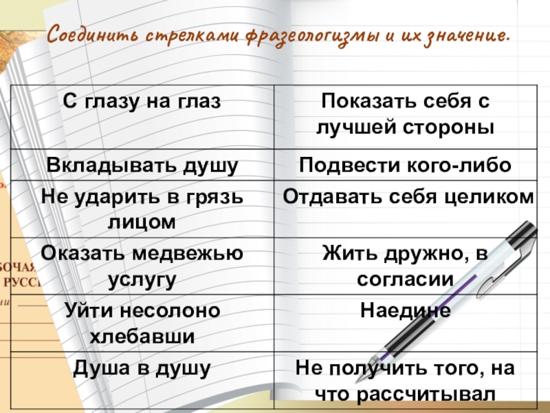 Соединить стрелками фразеологизмы и их значение.