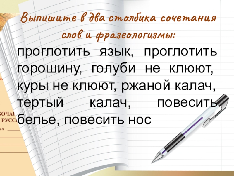 Выпишите в два столбика сочетания слов и фразеологизмы: