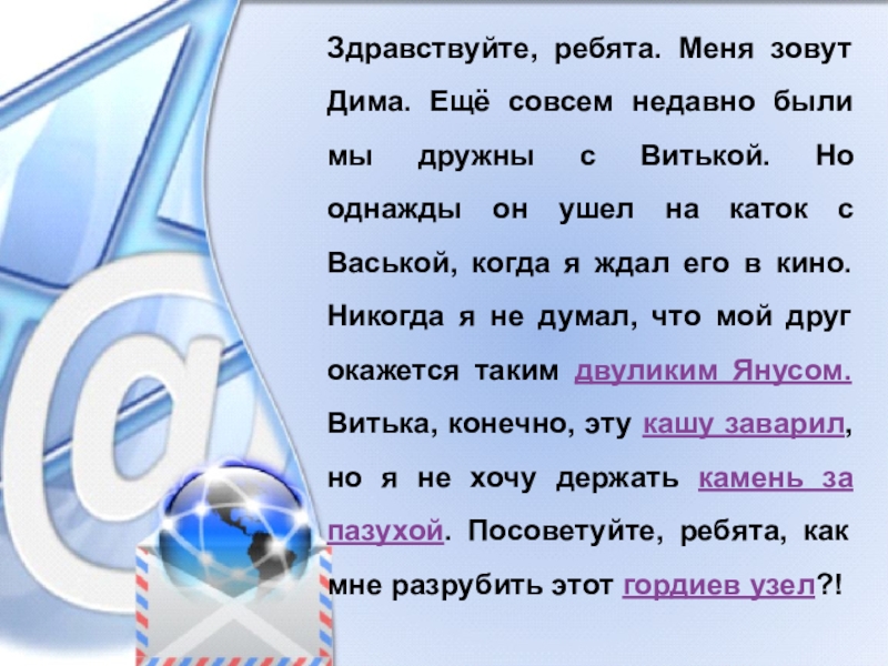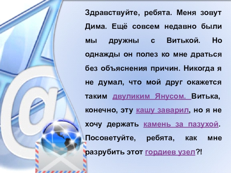 с Витькой. Но однажды он полез ко мне драться без объяснения причин. Никогда я не думал, что мой друг окажется таким двуликим Янусом. Витька, конечно, эту кашу заварил, но я не хочу держать камень за пазухой. Посоветуйте, ребята, как мне разрубить этот гордиев узел?!