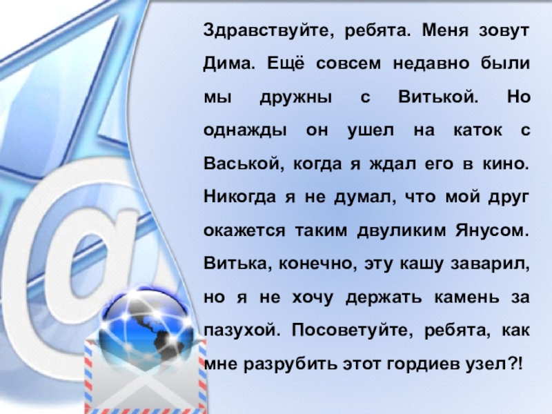 Слайд 39Здравствуйте, ребята. Меня зовут Дима. Ещё совсем недавно были мы дружны
