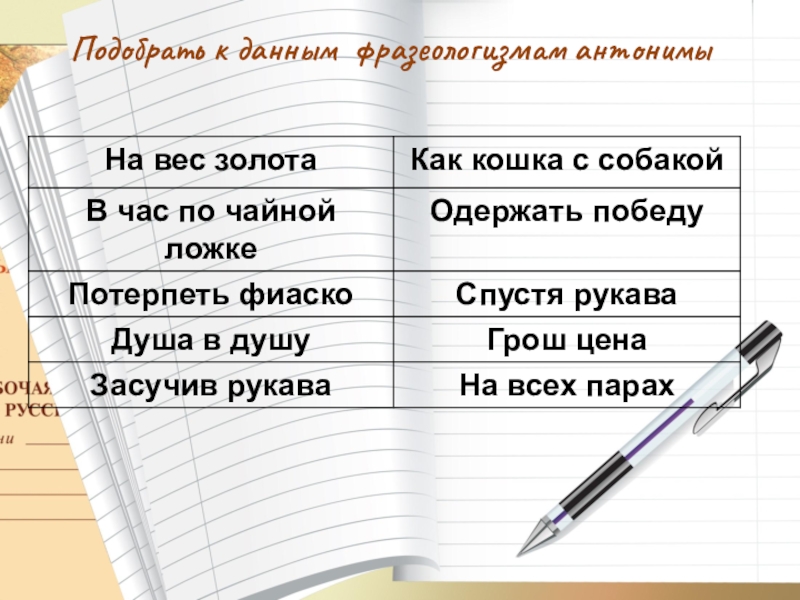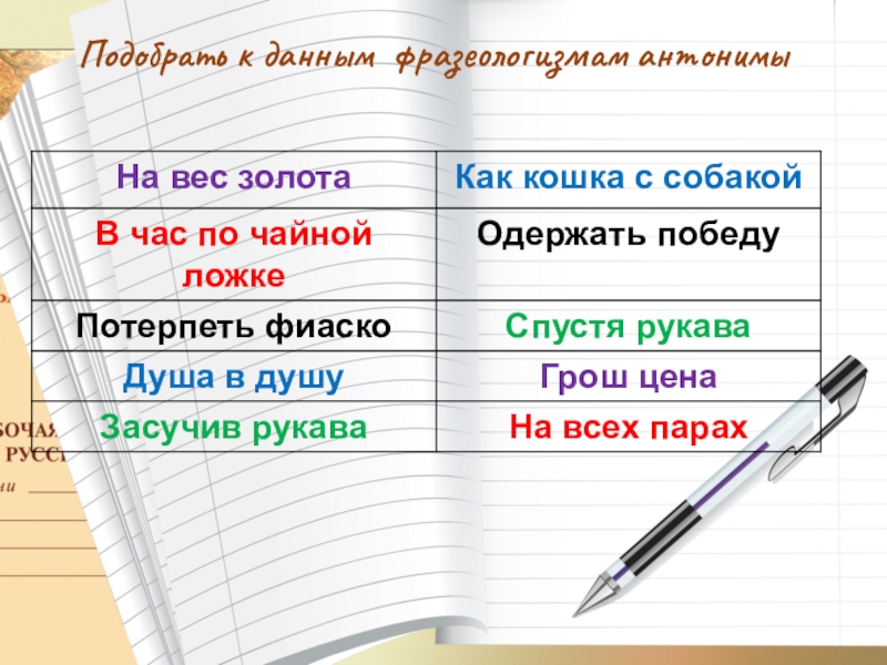 Подобрать к данным фразеологизмам антонимы