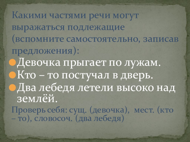 Какими частями речи могут выражаться подлежащие (вспомните самостоятельно, записав предложения):
