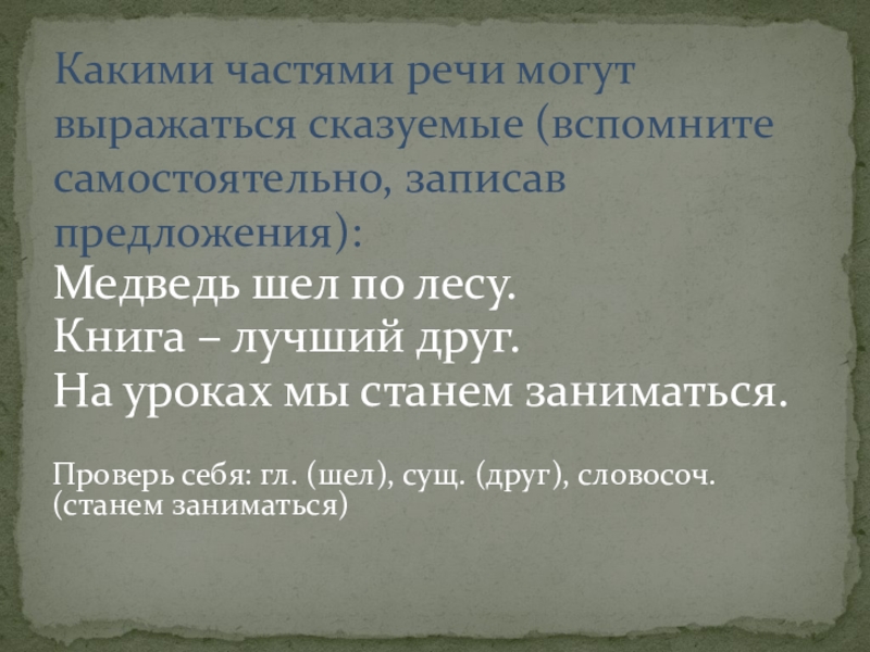 Какими частями речи могут выражаться сказуемые (вспомните самостоятельно, записав предложения):