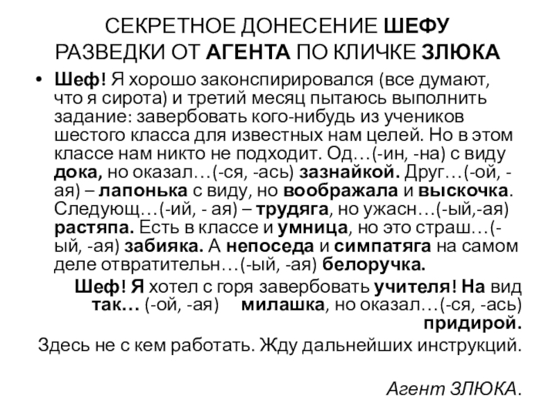 (все думают, что я сирота) и третий месяц пытаюсь выполнить задание: завербовать кого-нибудь из учеников шестого класса для известных нам целей. Но в этом классе нам никто не подходит. Од…(-ин, -на) с виду дока, но оказал…(-ся, -ась) зазнайкой. Друг…(-ой, -ая) – лапонька с виду, но воображала и выскочка. Следующ…(-ий, - ая) – трудяга, но ужасн…(-ый,-ая) растяпа. Есть в классе и умница, но это страш…(-ый, -ая) забияка. А непоседа и симпатяга на самом деле отвратительн…(-ый, -ая) белоручка.