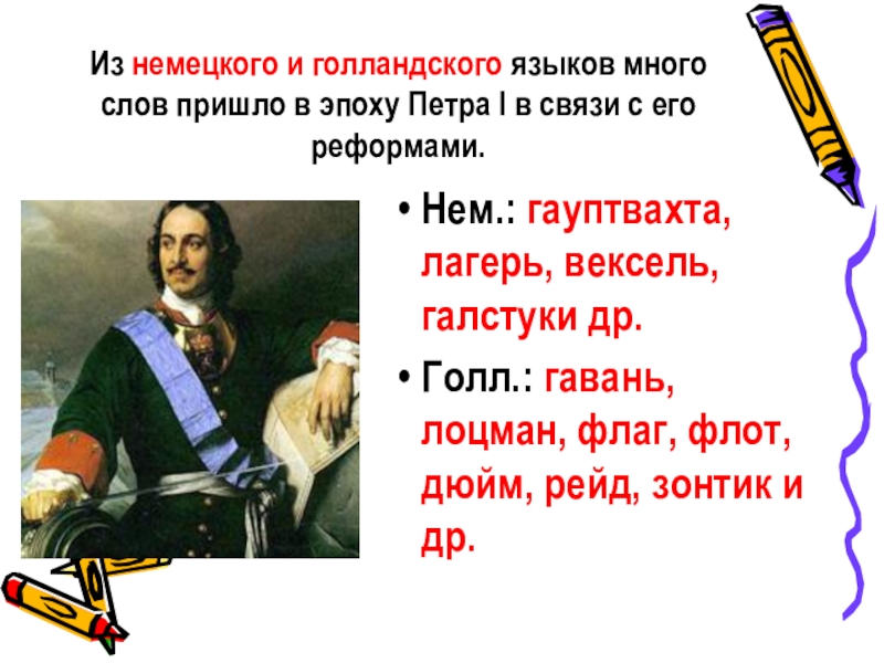 Нем.: гауптвахта, лагерь, вексель, галстуки др.