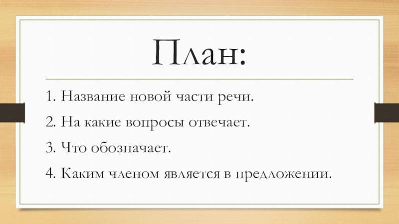 План:1. Название новой части речи.2. На какие вопросы отвечает.3. Что обозначает.4. Каким членом является в предложении.