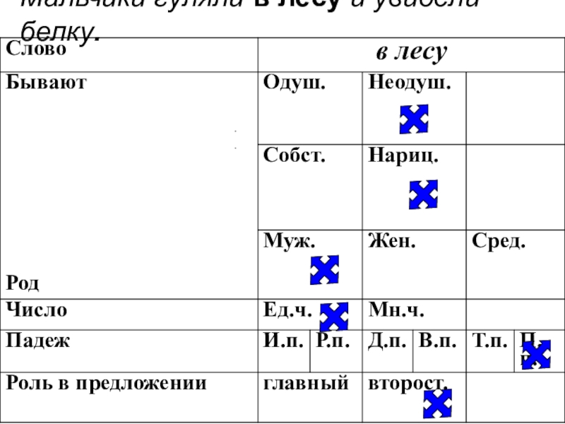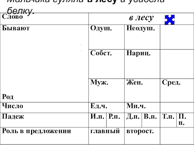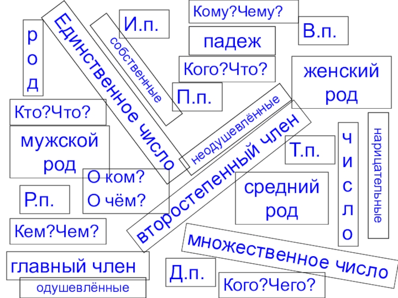 родчислопадежглавный членвторостепенный членженский родсредний родмужской родЕдинственное числомножественное числоИ.п.В.п.П.п.Р.п.Т.п.Д.п.Кто?Что?Кем?Чем?Кого?Что?Кого?Чего?Кому?Чему?О ком? О чём?одушевлённыенеодушевлённыесобственныенарицательные