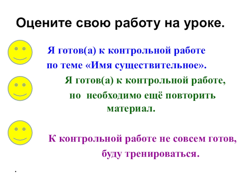 Оцените свою работу на уроке.Я готов(а) к контрольной работе по теме «Имя существительное».