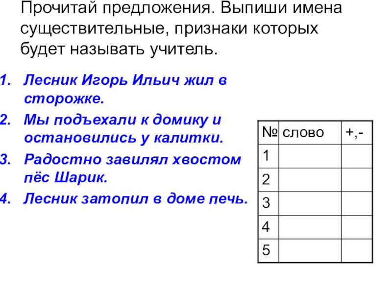 Слайд 7Прочитай предложения. Выпиши имена существительные, признаки которых будет называть учитель.