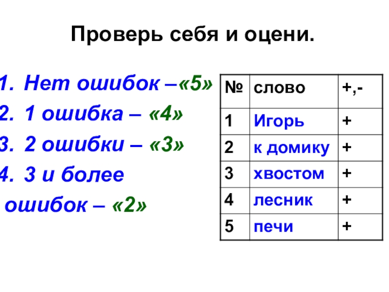 Проверь себя и оцени.Нет ошибок –«5»1 ошибка – «4»2 ошибки – «3»3 и более ошибок – «2»
