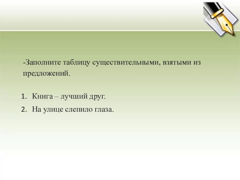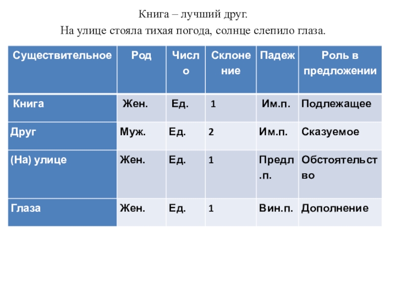 -Заполните таблицу существительными, взятыми из предложений.Книга – лучший друг.На улице слепило глаза.