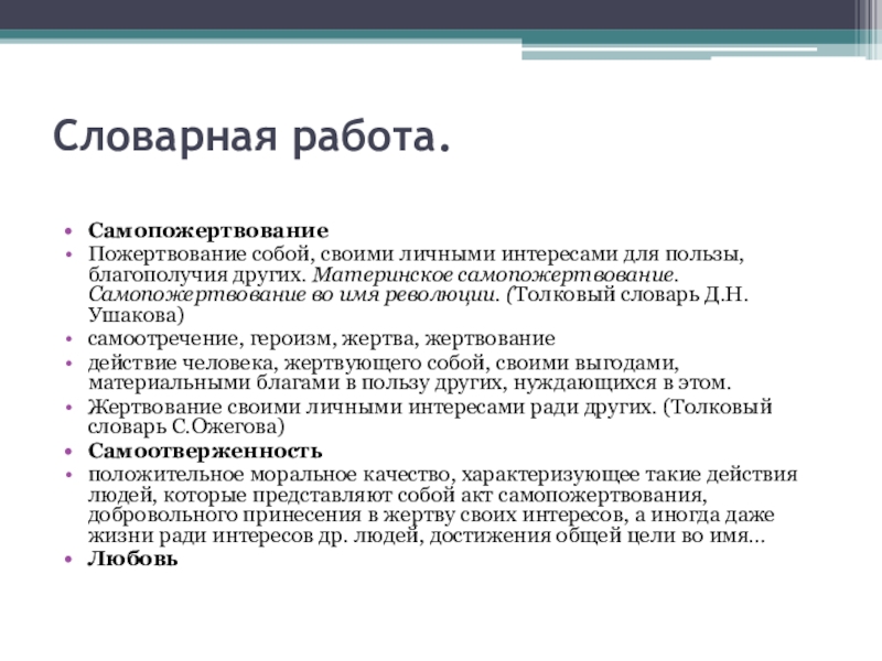 Жертвование своими личными интересами ради других. (Толковый словарь С.Ожегова)