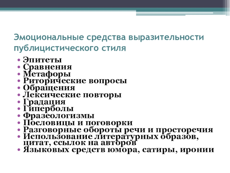 Слайд 11Эмоциональные средства выразительности публицистического стиля