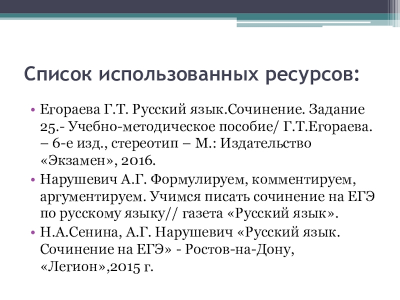 Нарушевич А.Г. Формулируем, комментируем, аргументируем. Учимся писать сочинение на ЕГЭ по русскому языку// газета «Русский язык».