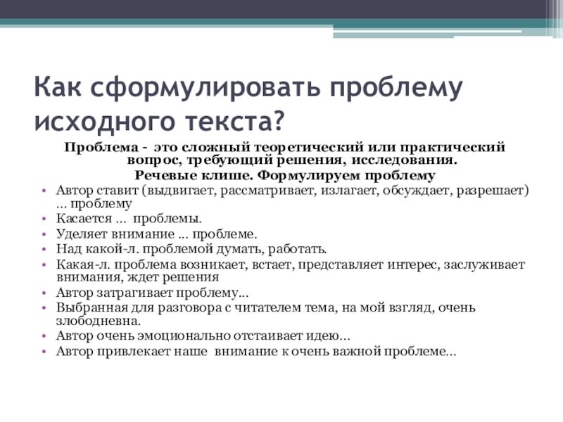 Автор ставит (выдвигает, рассматривает, излагает, обсуждает, разрешает) … проблему