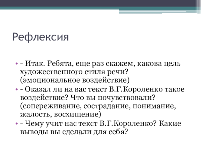 - Оказал ли на вас текст В.Г.Короленко такое воздействие? Что вы почувствовали? (сопереживание, сострадание, понимание, жалость, восхищение)