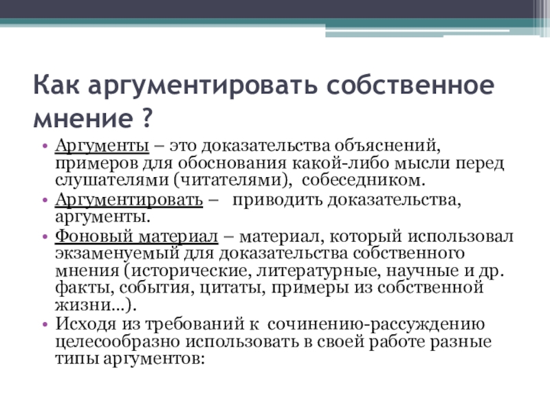 Фоновый материал – материал, который использовал экзаменуемый для доказательства собственного мнения (исторические, литературные, научные и др. факты, события, цитаты, примеры из собственной жизни…).