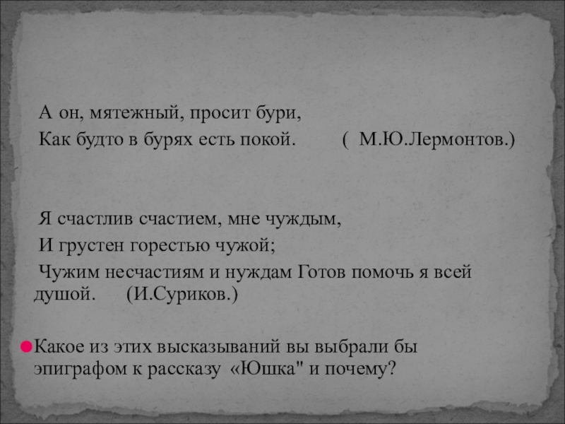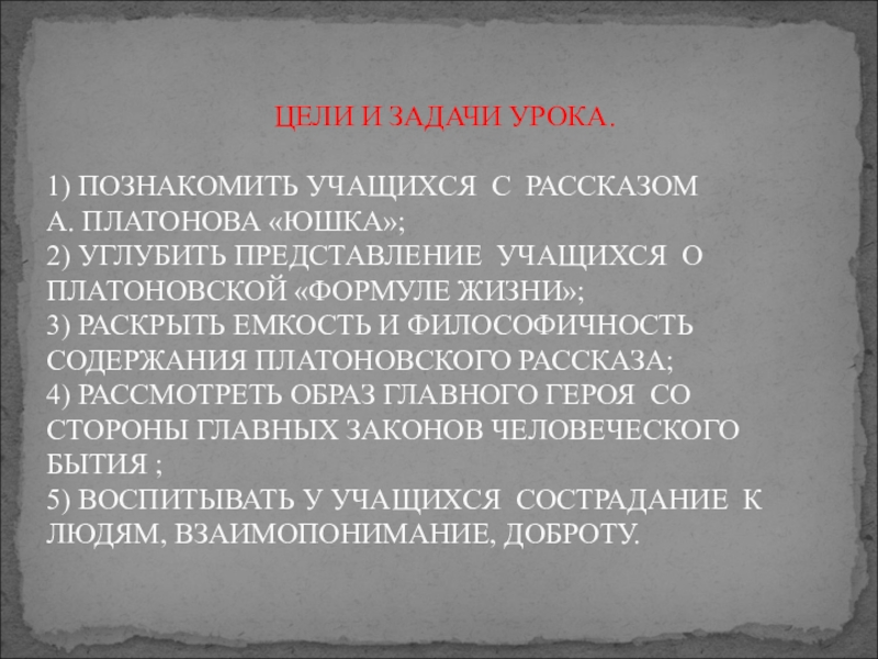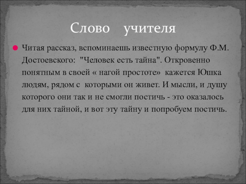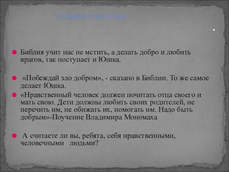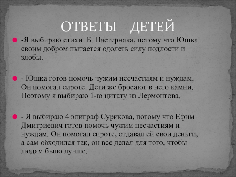 МЫ ПРОСЛЕДИМ ПО ТЕКСТУ, ИСПОЛЬЗУЯ ВОПРОСЫ НА ДОСКЕ, КАК ОТНОСИЛИСЬ К ЮШКЕ ВЗРОСЛЫЕ И ДЕТИ?