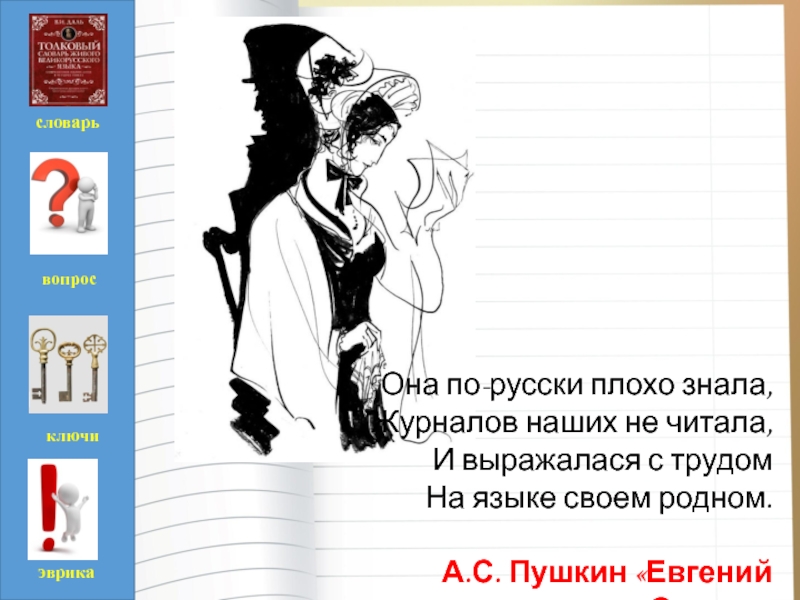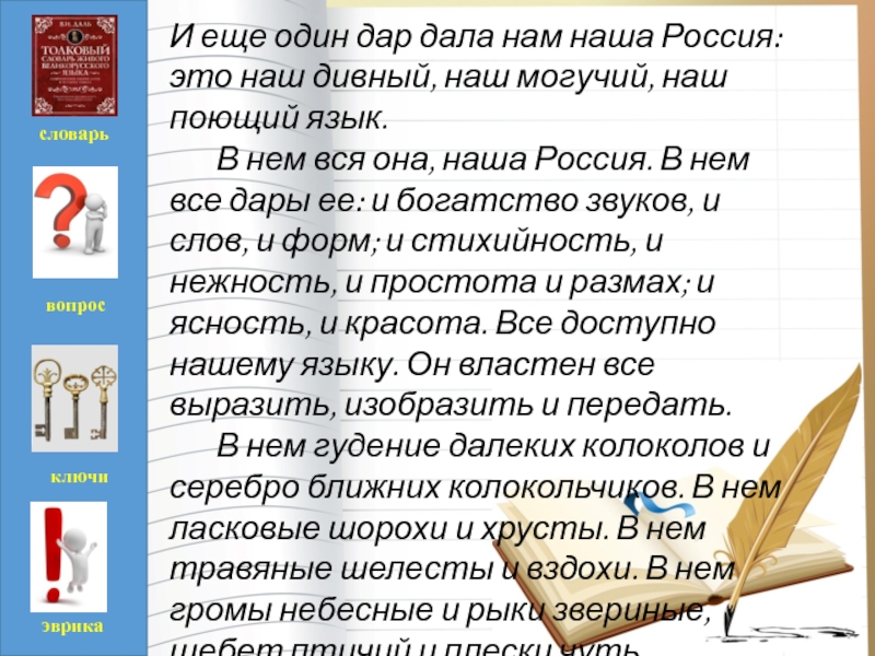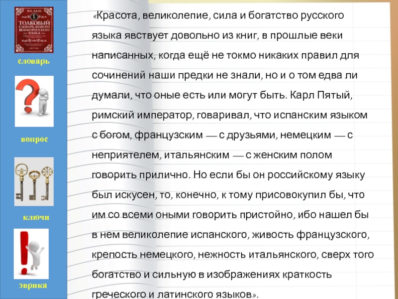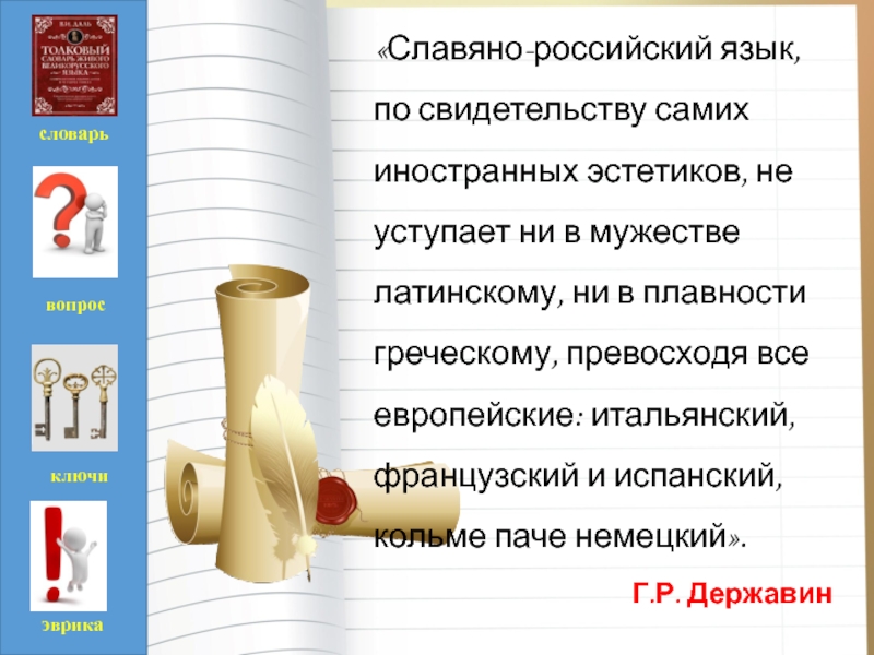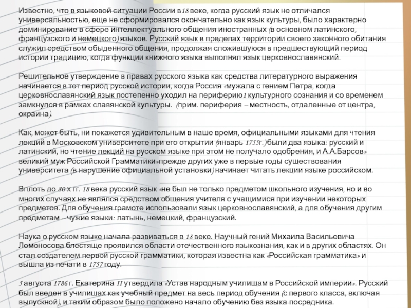 Решительное утверждение в правах русского языка как средства литературного выражения начинается в тот период русской истории, когда Россия «мужала с гением Петра, когда церковнославянский язык постепенно уходил на периферию1 культурного сознания и со временем замкнулся в рамках славянской культуры. (прим. периферия – местность, отдаленные от центра, окраина).