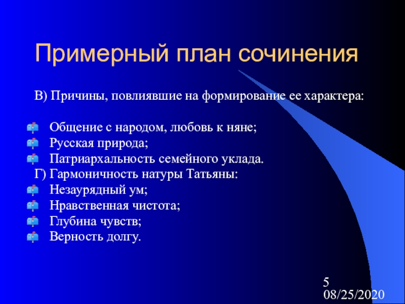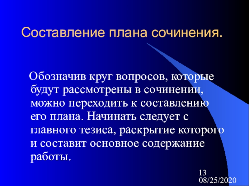 coчинении, можно переходить к составлению его плана. Начинать следует с главного тезиса, раскрытие которого и составит основное содержание работы.