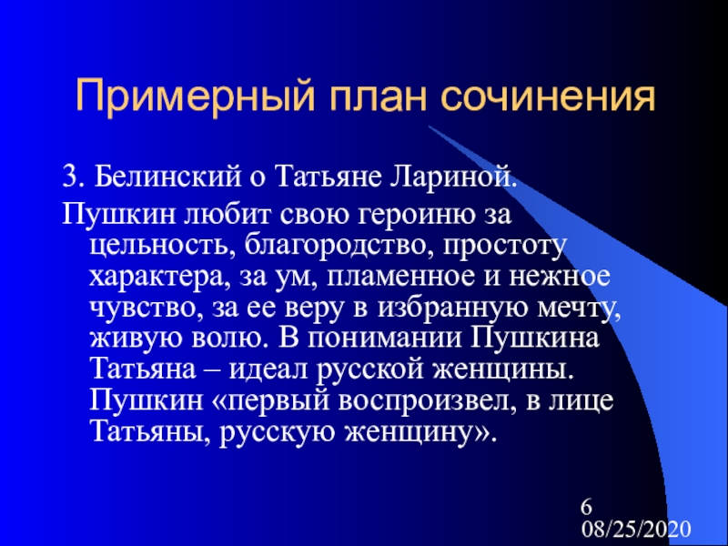 за цельность, благородство, простоту характера, за ум, пламенное и нежное чувство, за ее веру в избранную мечту, живую волю. В понимании Пушкина Татьяна – идеал русской женщины. Пушкин «первый воспроизвел, в лице Татьяны, русскую женщину».