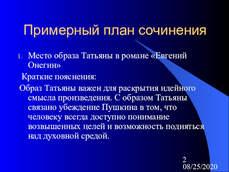 Образ Татьяны важен для раскрытия идейного смысла произведения. С образом Татьяны связано убеждение Пушкина в том, что человеку всегда доступно понимание возвышенных целей и возможность подняться над духовной средой.
