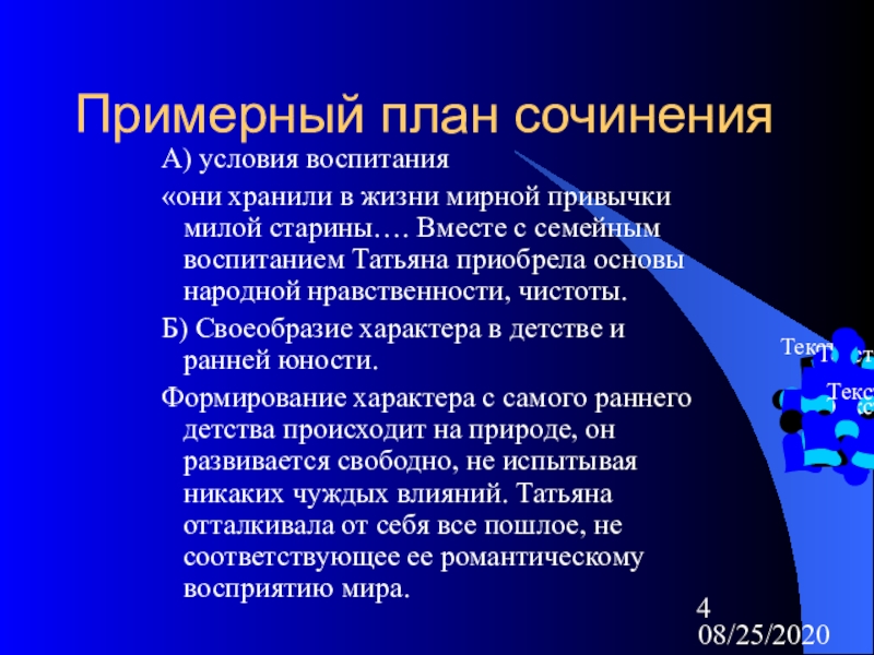 Формирование характера с самого раннего детства происходит на природе, он развивается свободно, не испытывая никаких чуждых влияний. Татьяна отталкивала от себя все пошлое, не соответствующее ее романтическому восприятию мира.