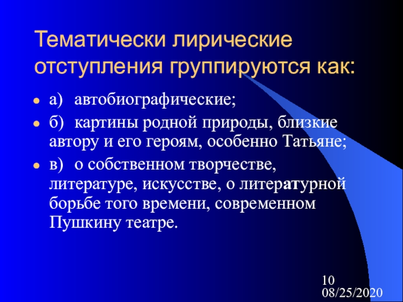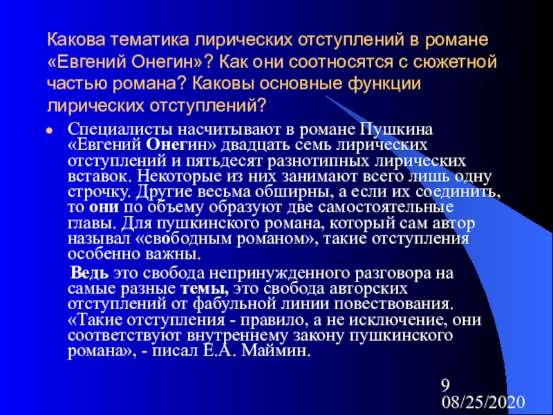 Какова тематика лирических отступлений в романе «Евгений Онегин»? Как они соотносятся