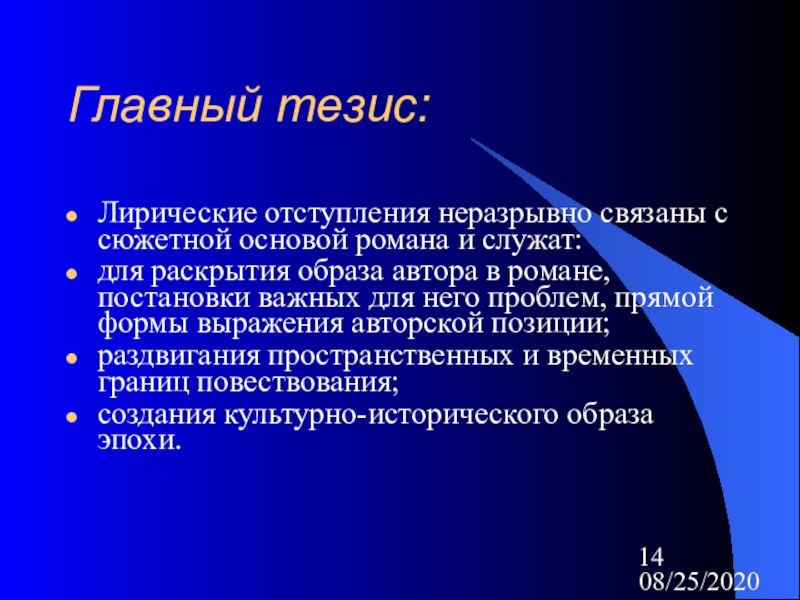 - раскрытие образа автора в романе, постановка важных для него проблем, прямая форма выражения авторской позиции;