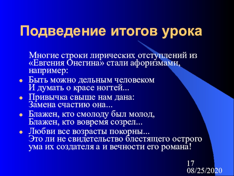 Специалисты насчитывают в романе Пушкина «Евгений Онегин» двадцать семь лирических отступлений и пятьдесят разнотипных лирических вставок. Некоторые из них занимают всего лишь одну строчку. Другие весьма обширны, а если их соединить, то они по объему образуют две самостоятельные главы. Для пушкинского романа, который сам автор называл «свободным романом», такие отступления особенно важны.