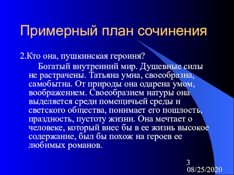 мир. Душевные силы не растрачены. Татьяна умна, своеобразна, самобытна. От природы она одарена умом, воображением. Своеобразием натуры она выделяется среди помещичьей среды и светского общества, понимает его пошлость, праздность, пустоту жизни. Она мечтает о человеке, который внес бы в ее жизнь высокое содержание, был бы похож на героев ее любимых романов.