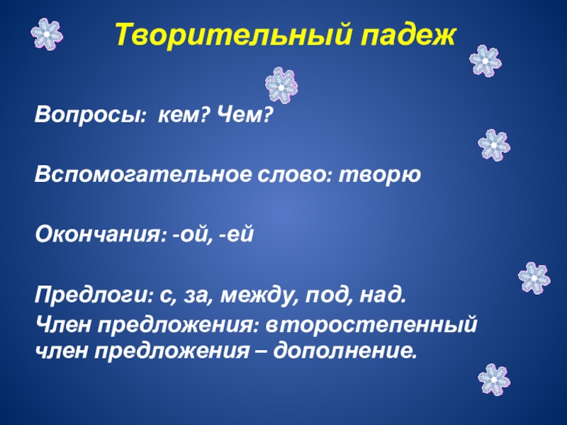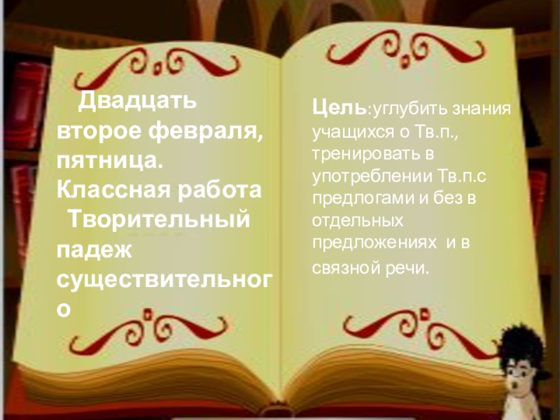 Цель:углубить знания учащихся о Тв.п., тренировать в употреблении Тв.п.с предлогами и без в отдельных предложениях и в связной речи.