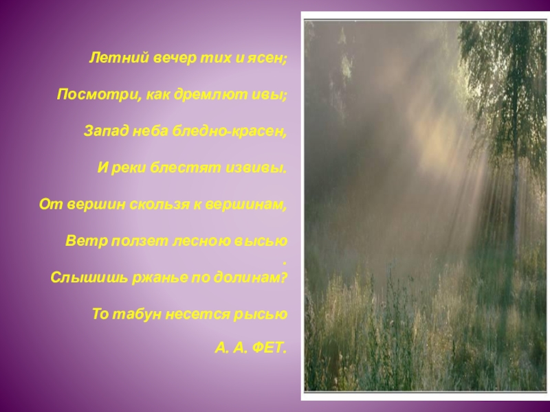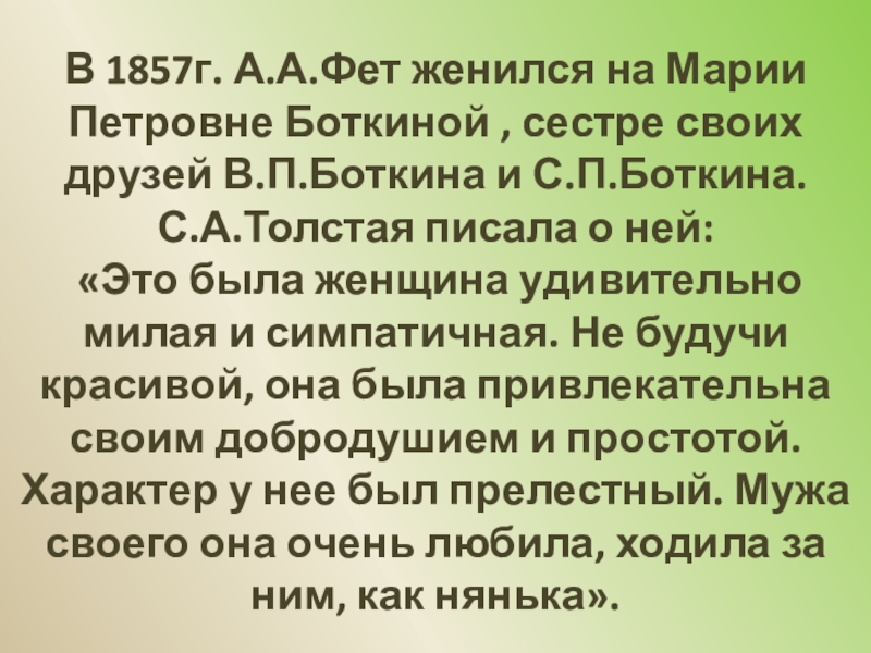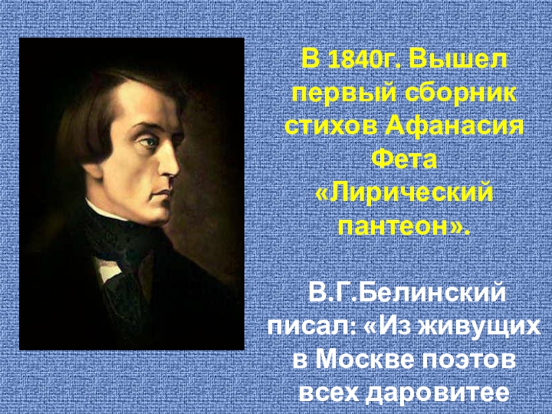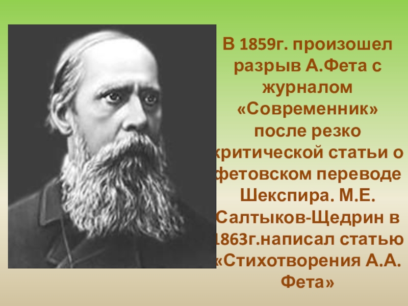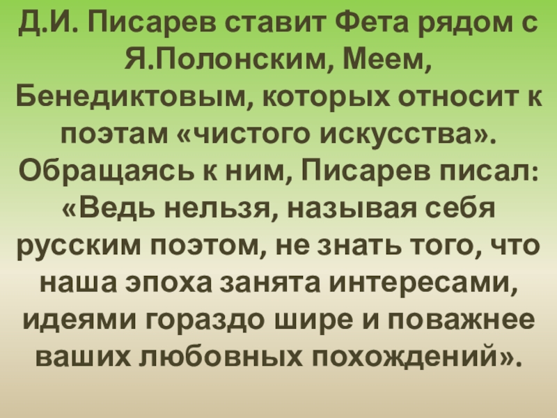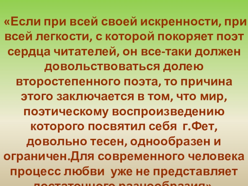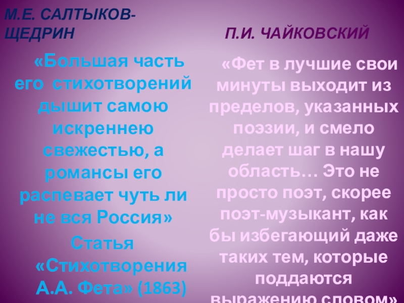«Фет в лучшие свои минуты выходит из пределов, указанных поэзии, и смело делает шаг в нашу область… Это не просто поэт, скорее поэт-музыкант, как бы избегающий даже таких тем, которые поддаются выражению словом»