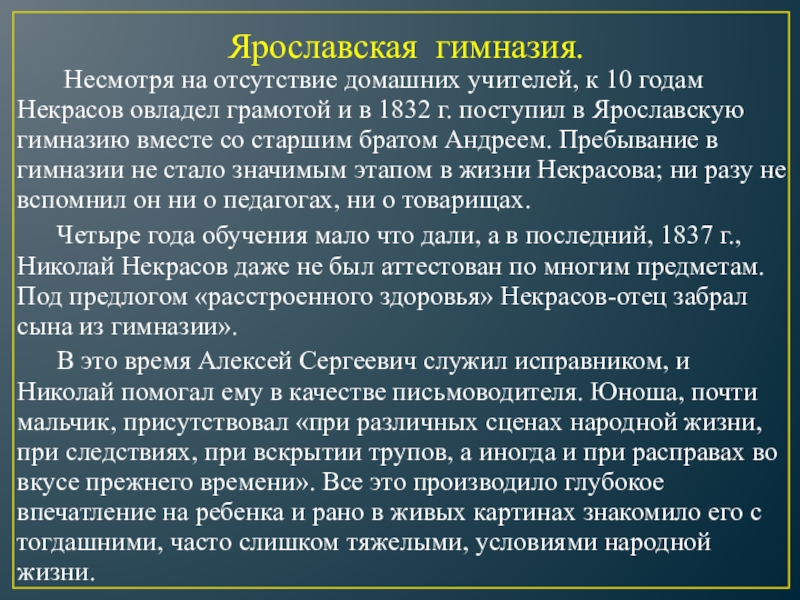 грамотой и в 1832 г. поступил в Ярославскую гимназию вместе со старшим братом Андреем. Пребывание в гимназии не стало значимым этапом в жизни Некрасова; ни разу не вспомнил он ни о педагогах, ни о товарищах.