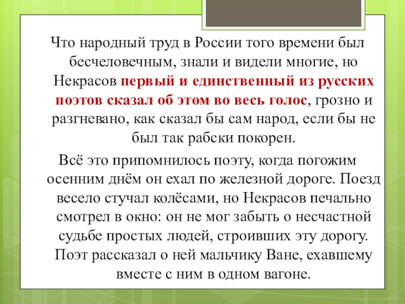 Всё это припомнилось поэту, когда погожим осенним днём он ехал по железной дороге. Поезд весело стучал колёсами, но Некрасов печально смотрел в окно: он не мог забыть о несчастной судьбе простых людей, строивших эту дорогу. Поэт рассказал о ней мальчику Ване, ехавшему вместе с ним в одном вагоне.