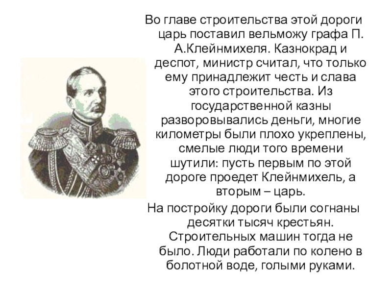 Слайд 35Во главе строительства этой дороги царь поставил вельможу графа П.А.Клейнмихеля. Казнокрад