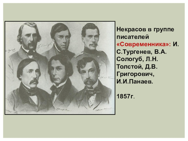 Слайд 17Некрасов в группе писателей «Современника»: И.С.Тургенев, В.А.Сологуб, Л.Н.Толстой, Д.В.Григорович,