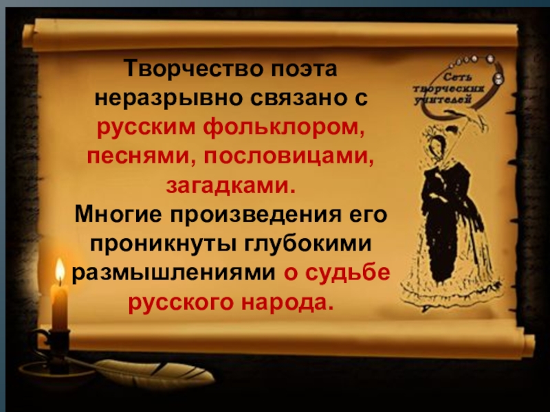 Слайд 32Творчество поэта неразрывно связано с русским фольклором, песнями, пословицами, загадками.
