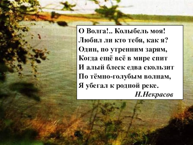 Детские воспоминания поэта связаны с Волгой, которой он посвятил много стихов. Здесь он впервые увидел глубокое человеческое страдание. Он брел по берегу в жаркую пору и вдруг услышал стоны и увидел бурлаков, которые брели вдоль реки, «почти пригнувшись головой /К ногам, обвитым бечевой».