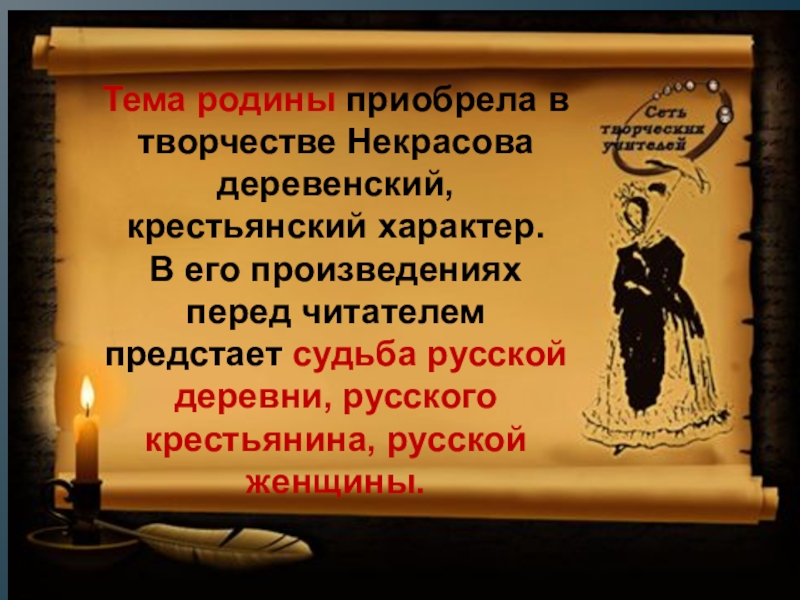 Слайд 31Тема родины приобрела в творчестве Некрасова деревенский, крестьянский характер.