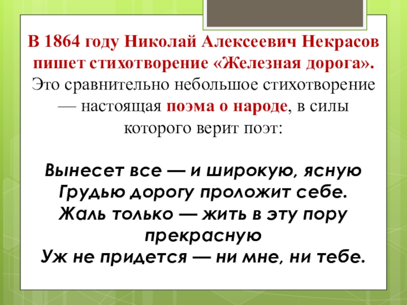 Слайд 40В 1864 году Николай Алексеевич Некрасов пишет стихотворение «Железная дорога».